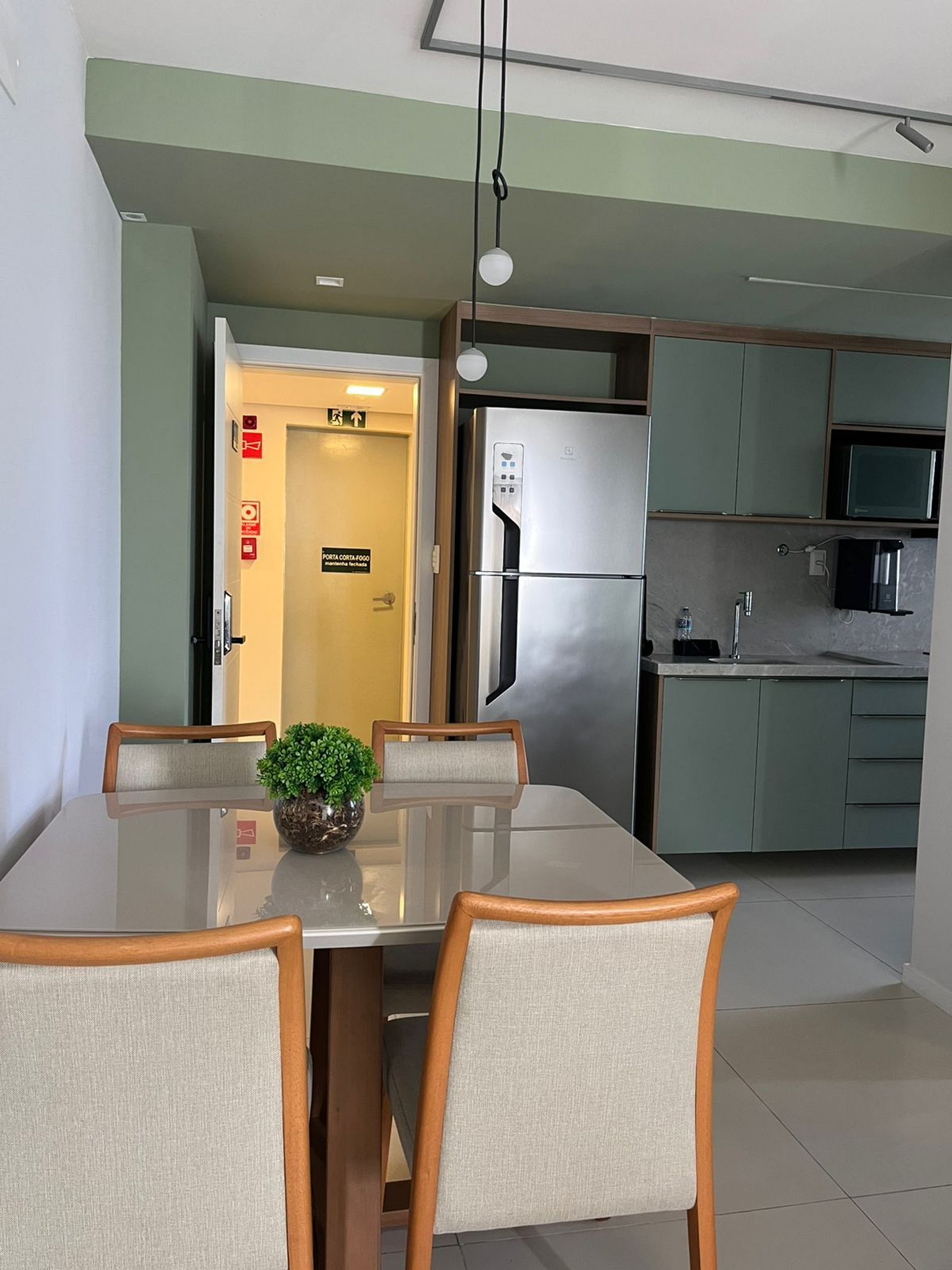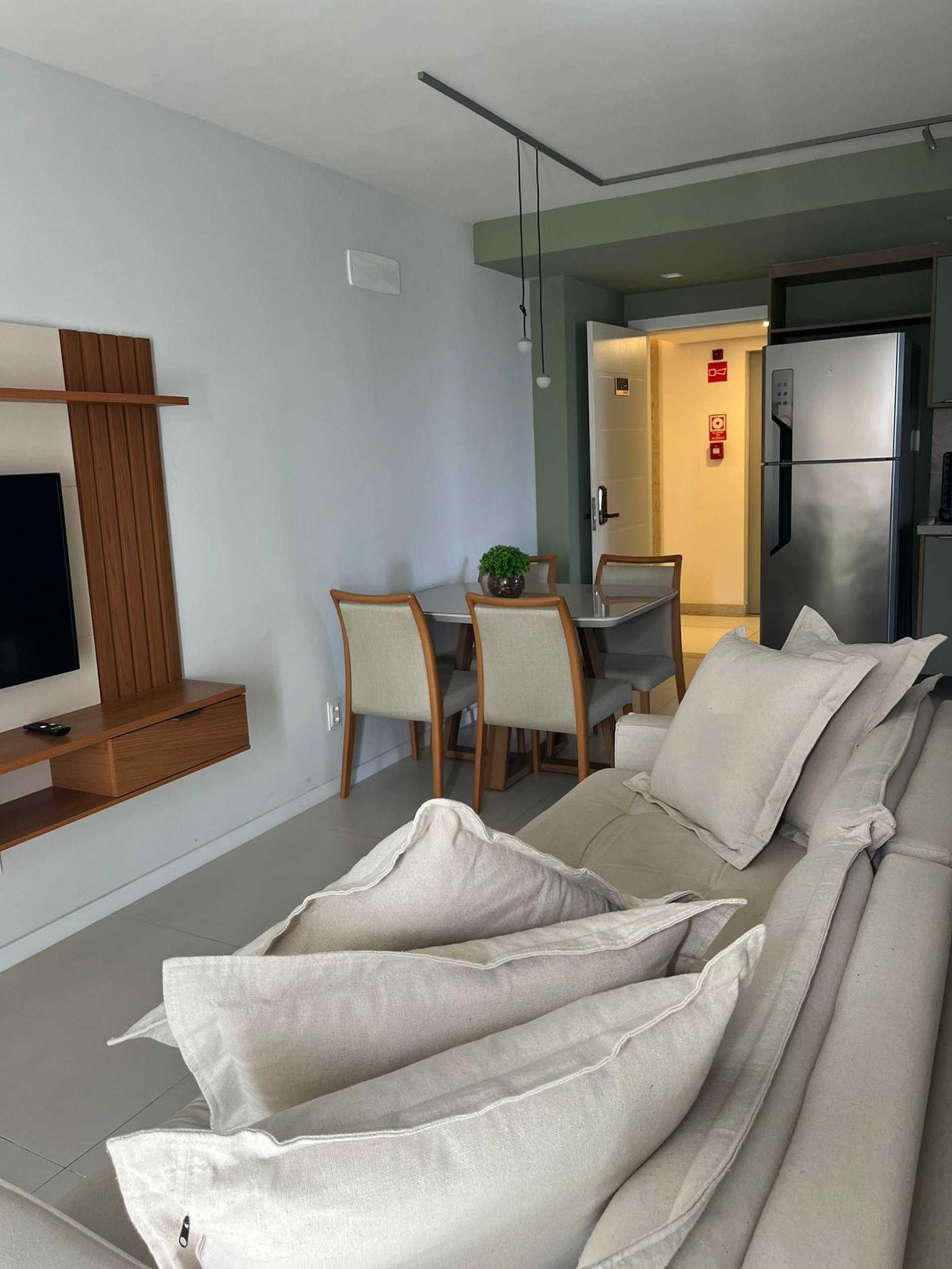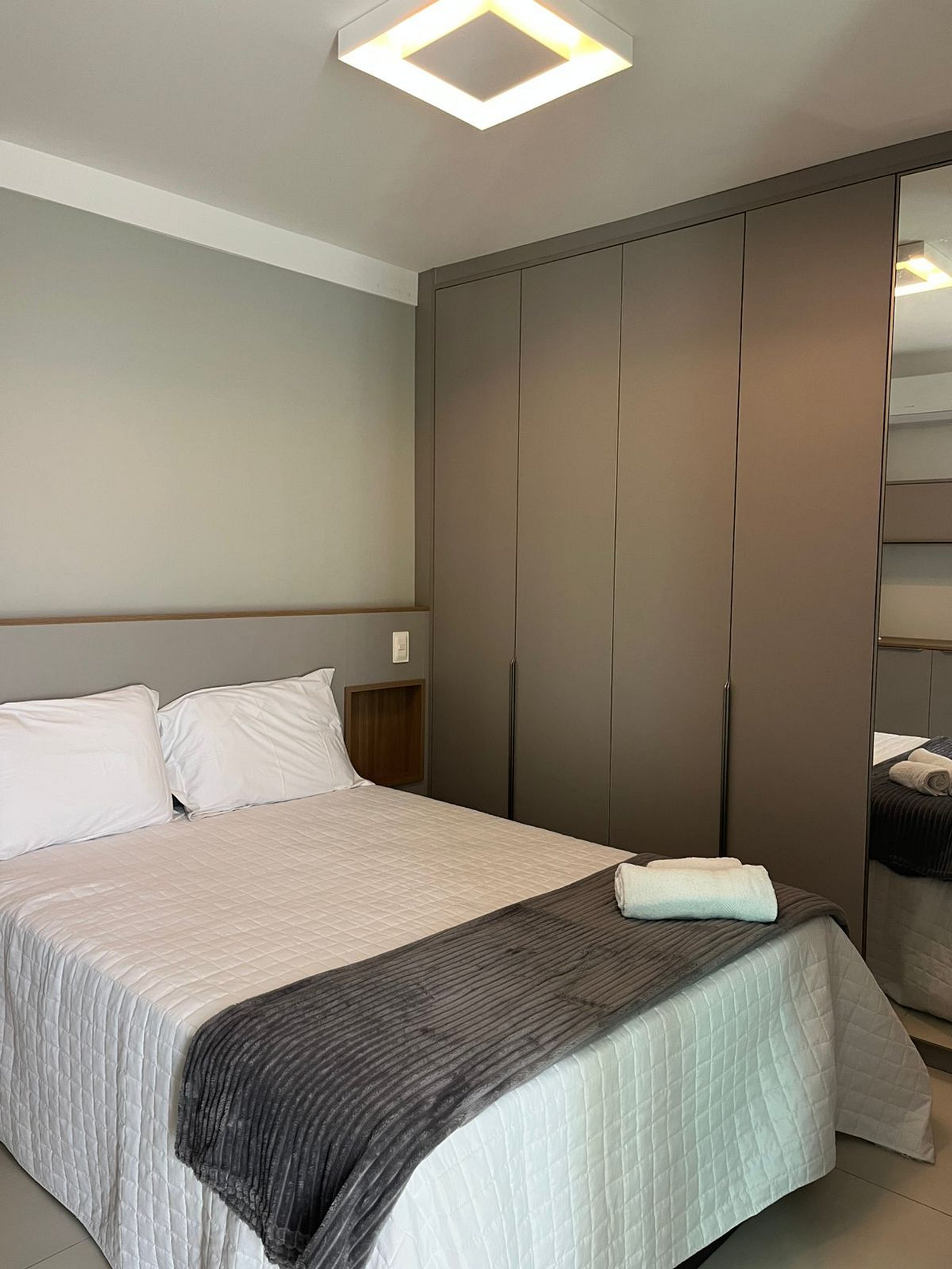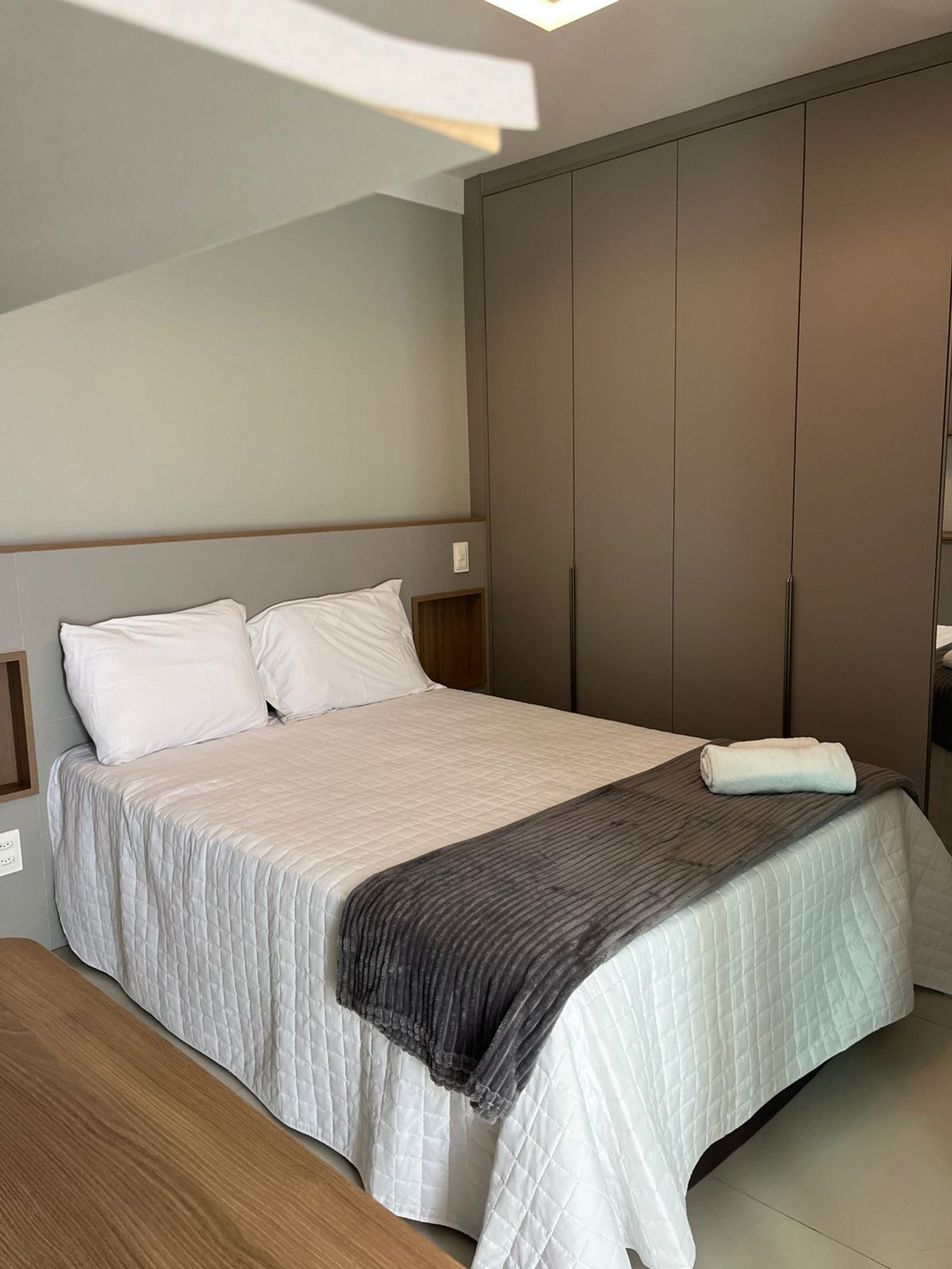 Hospitalidade nos Detalhes: Mobília planejada para otimizar o espaço de 1 quarto, garantindo que a estadia não pareça apertada, mas sim acolhedora.